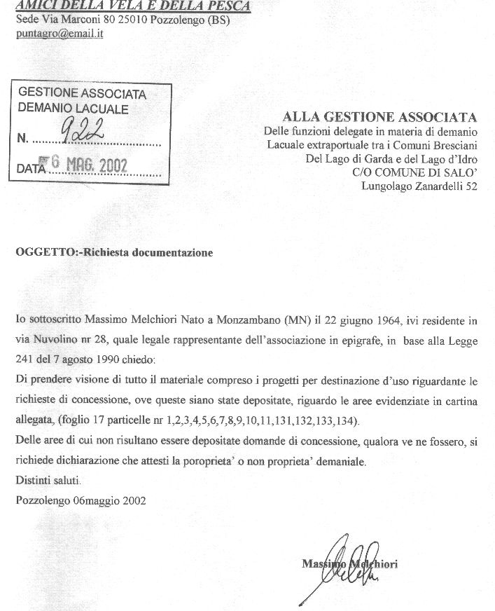 Resta infine da segnalare una situazione che ci lascia stupiti. Abbiamo presentato all'agenzia del demanio di Brescia una precisa richiesta di informazioni riguardo alla zona di Punta Grò. Abbiamo effettuato numerose telefonate e siamo passati tre volte di persona ma... non abbiamo ottenuto ancora risposta. Il termine ultimo scade il 24 maggio. Pensate che a una precedente domanda depositata il 28 settembre 2001 non è stata data ancora risposta.